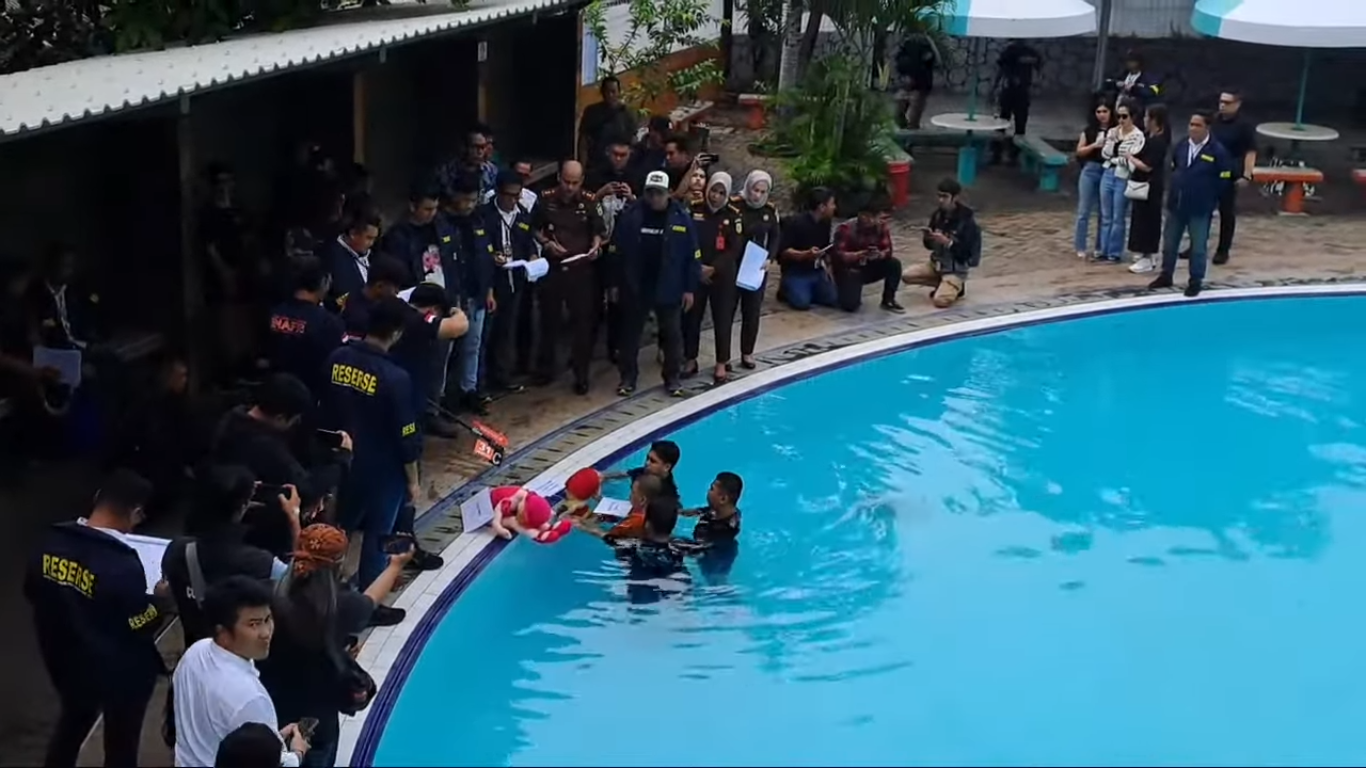 Setelah itu, reka adegan dilanjutkan ke TKP di Kolam Renang Taman Air Tirtamas Pondok Kelapa, Duren Sawit, Jakarta Timur. Dari pantauan tim Cumicumi, Tamara Tyasmara juga hadir dalam reka adegan di kolam renang tersebut dan menyaksikan sang mantan kekasih melakukan adegan keji menghabisi nyawa putranya.