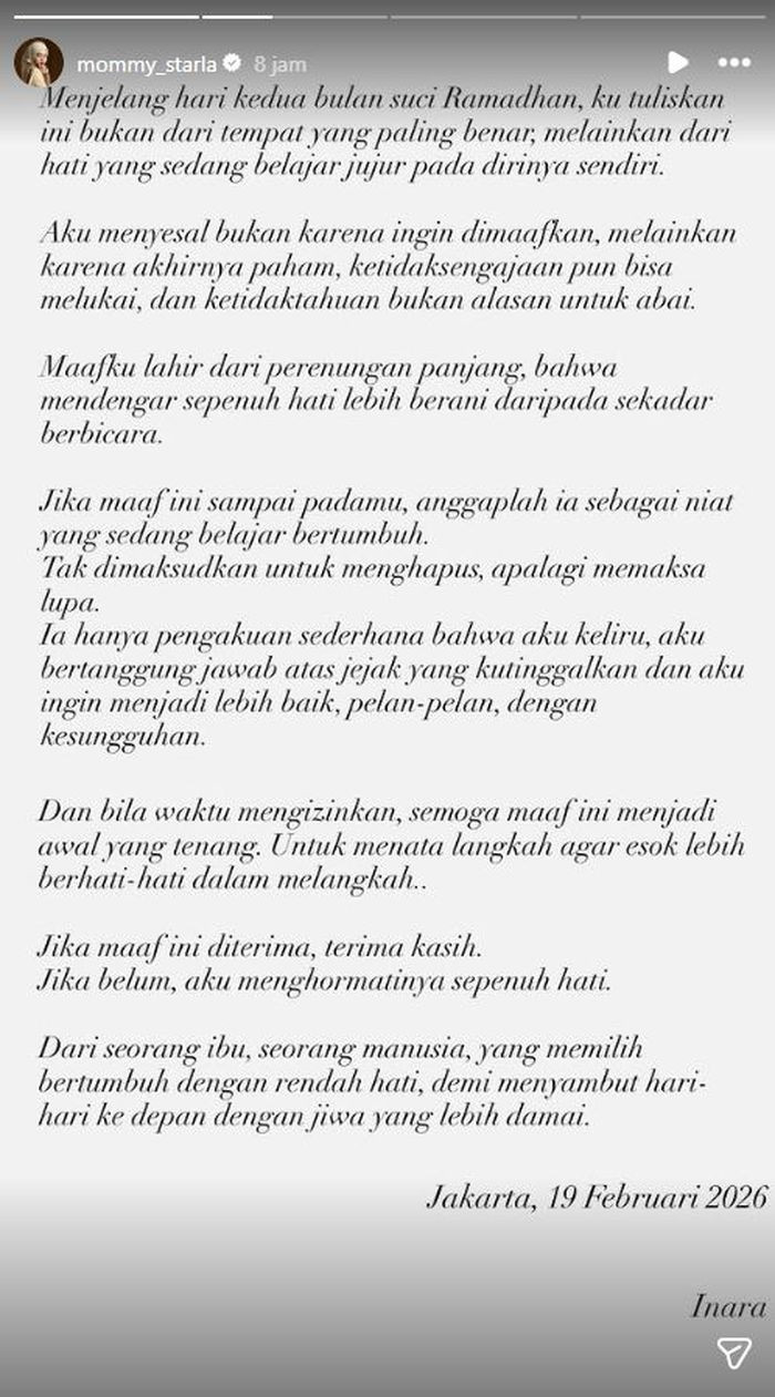 "Menjelang hari kedua bulan suci Ramadan, ku tuliskan ini bukan dari tempat yang paling benar, melainkan dari hati yang sedang belajar jujur pada dirinya sendiri. Aku menyesal bukan karena ingin dimaafkan, melainkan karena akhirnya paham, ketidaksengajaan pun bisa melukai, dan ketidaktahuan bukan alasan untuk abai. Maafku lahir dari perenungan panjang, bahwa mendengar sepenuh hati lebih berani daripada sekedar berbicara," kata Inara Rusli.