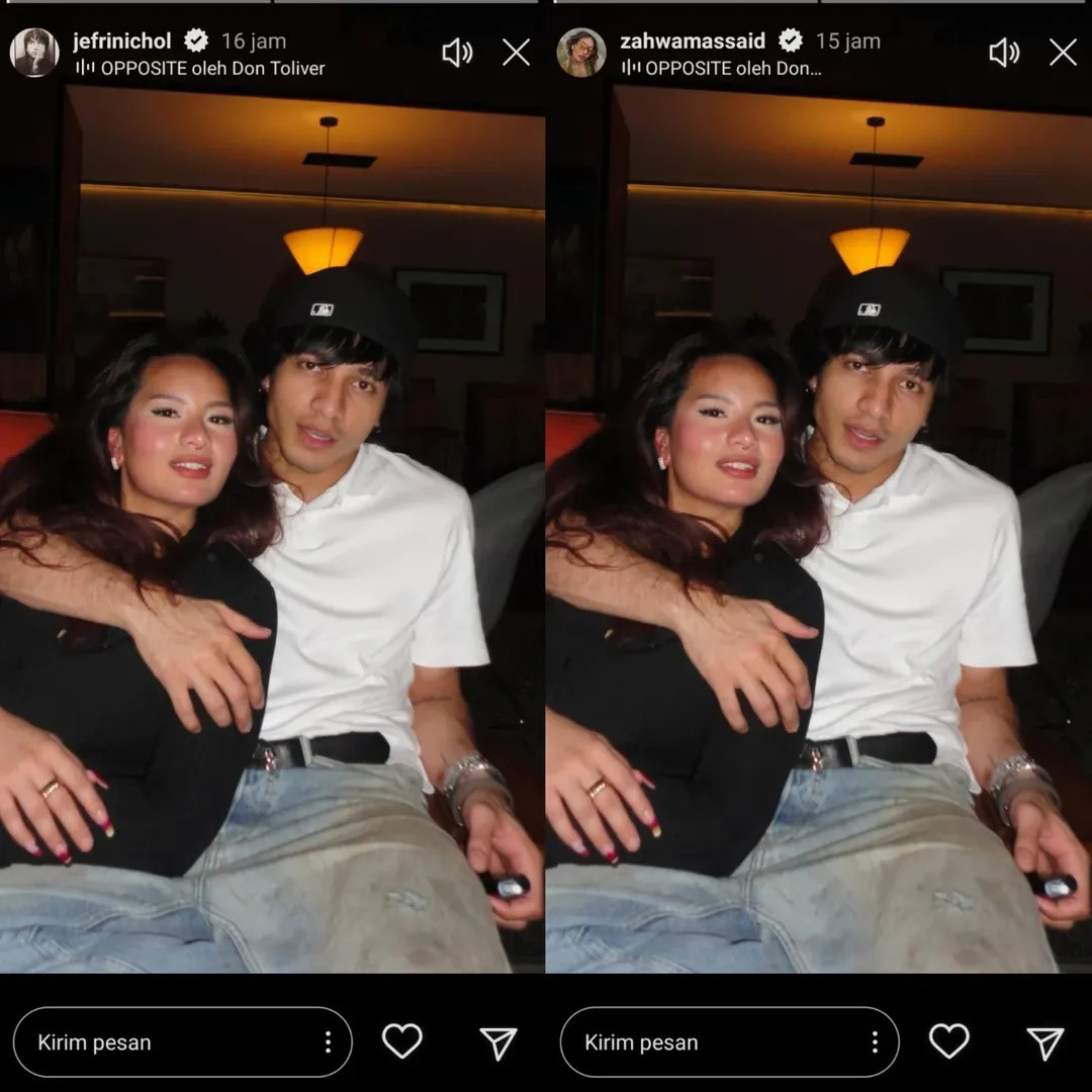 Dalam ungggahan tersebut, sang aktor terlihat mengenakan kaus putih, celana jeans, dan topi hitam. Dia tampak memeluk Zahwa yang bersandar manja di tubuhnya. Tak lama kemudian, Zahwa Massaid terlihat mengunggah ulang postingan itu di Story Instagram pribadinya. Meski keduanya kompak tak memberikan penjelasan apapun, namun unggahan ini langsung ramai menuai komentar warganet.