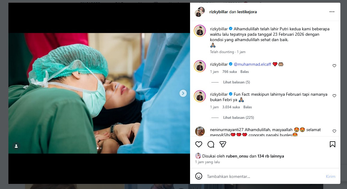 "Alhamdulillah telah lahir Putri kedua kami beberapa waktu lalu tepatnya pada tanggal 23 Februari 2026 dengan kondisi yang alhamdulillah sehat dan baik," tulis Rizky Billar.