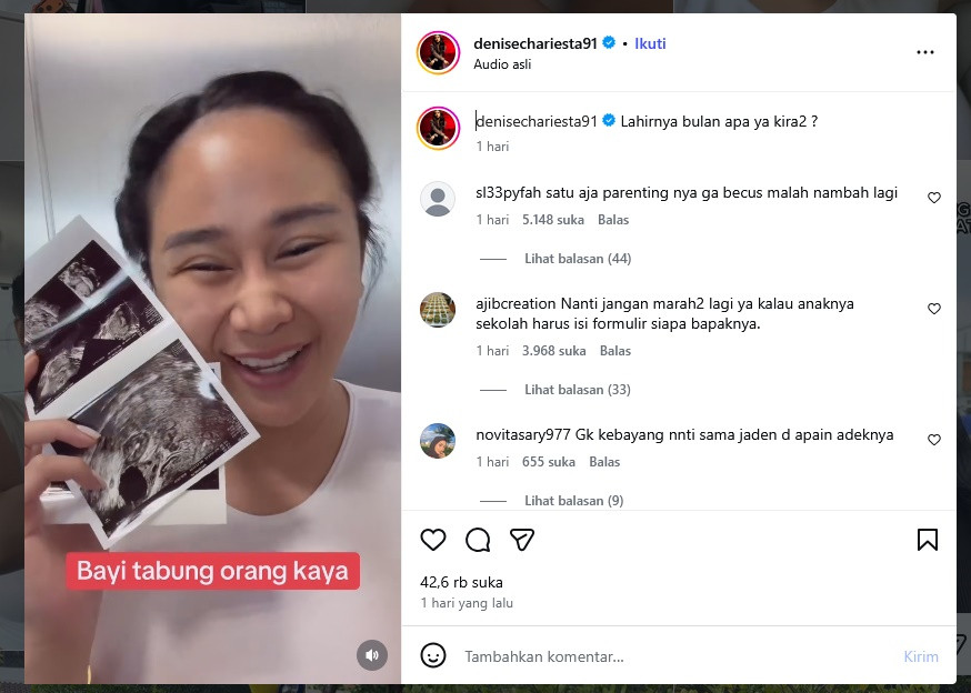 Sementara itu, rencana Denise untuk menjalani bayi tabung itu menuai beragam respon dari warganet, tidak sedikit yang menghujat wanita yang sempat berkonflik dengan Razman Arif tersebut.