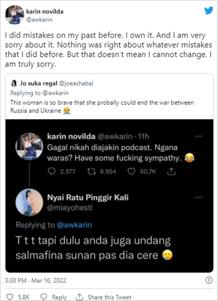 Rupanya imbas cuitan tersebut, membuat netizen mengungkit masa lalu Awkarin. Netizen mengingatkan jika Awkarin pernah melakukan hal serupa, mengajak Salmafina Sunan hadir ke podcastnya usai bercerai dari Taqy Malik. Terkait hal ini, Awkarin pun segera buka suara dan meminta maaf.