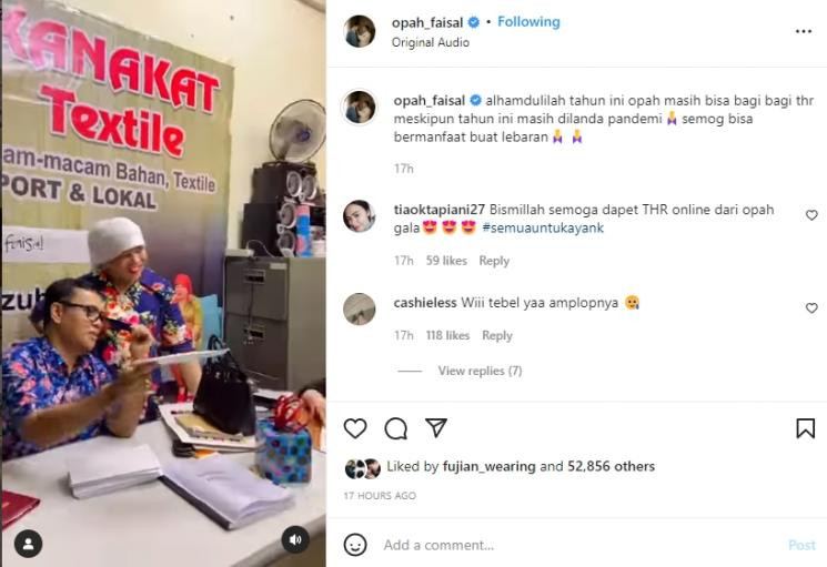 "Alhamdulilah tahun ini opah masih bisa bagi-bagi THR meskipun tahun ini masih dilanda pandemi. Semoga bisa bermanfaat buat lebaran," tulis Haji Faisal.