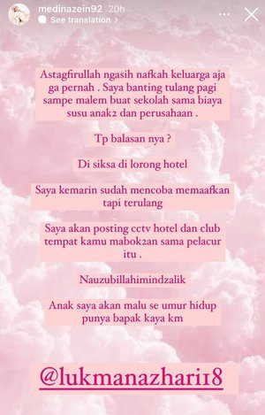 Medina Zein juga curhat di Instagram Story soal perlakuan kasar yang dilakukan Lukman Azhari.