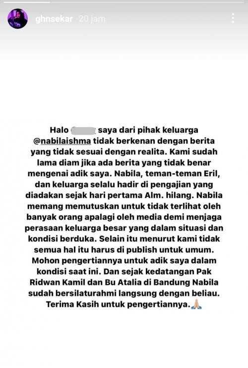 Lewat Instagram Story, Ghina mengatakan bahwa sang adik tak pernah absen di acara pengajian yang diadakan keluarga Ridwan Kamil. Ia juga mengatakan jika Nabila memang sengaja menghindari awak media agar tidak tersorot karena memikirkan keluarga Eril yang tengah berduka.