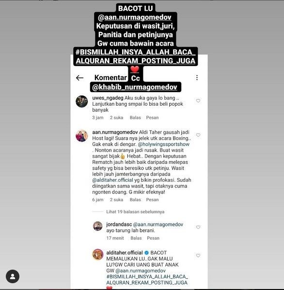"Bacot memalukan lu, enggak malu lu? Gue cari uang buat anak gue @aan.nurmagomedov," balas Aldi Taher dalam unggahan tersebut.
