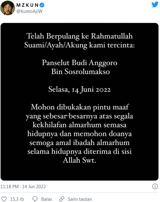Anggoro bin Sosrolumakso. Selasa, 14 Juni 2022," tulis Kunto Aji, Rabu