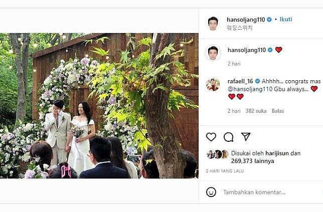 Dalam unggahan tersebut tampak pernikahan Jang Hansol berlangsung di lokasi outdoor yang penuh dengan dekorasi pepohonan, kayu, hingga bunga-bunga.