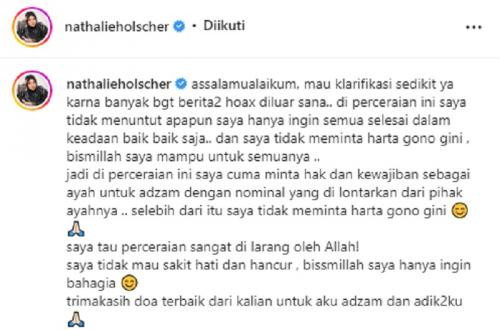 "Assalamualaikum, mau klarifikasi sedikit ya karna banyak bgt berita2 hoax diluar sana.. di perceraian ini saya tidak menuntut apapun saya hanya ingin semua selesai dalam keadaan baik baik saja.. dan saya tidak meminta harta gono gini, bismillah saya mampu untuk semuanya," tulis Nathalie Holscher