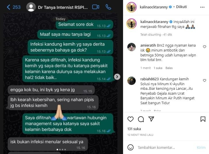 Tak lama, Kalina yang mengetahui hal tersebut, dengan sifap memberikan klarifikasi, yakni dirinya hanya mengidap infeksi saluran kemih bukan penyakit kelamin menular. Ia bahkan mengunggah percakapan dengan seorang dokter, untuk menambah validasi. (ND)