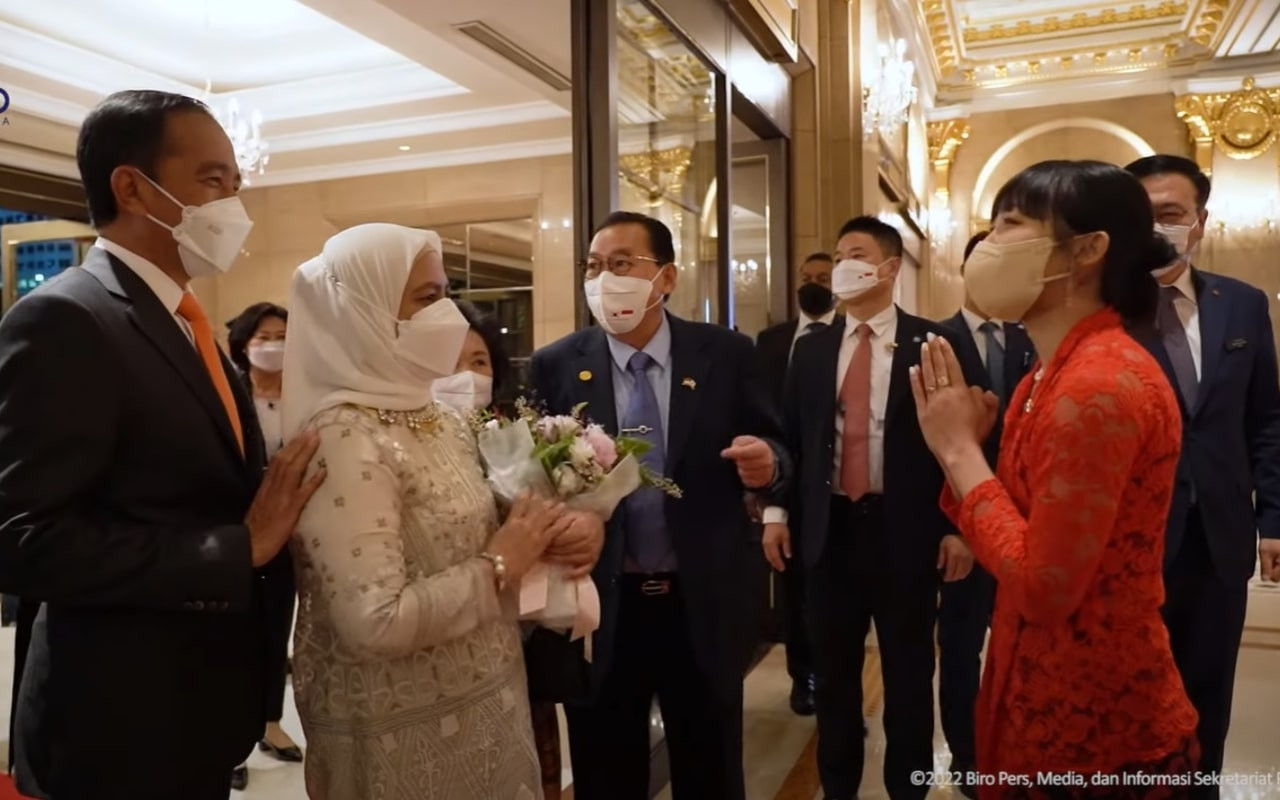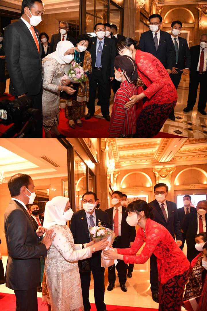 Duta Besar RI untuk Korea Selatan Gandi Sulistiyanto, yang berdiri di antara mereka, memperkenalkan Dita Karang kepada Jokowi dan Iriana.