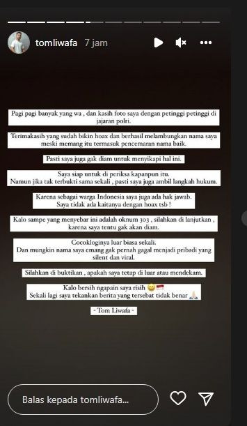 "Pagi pagi banyak yang WhatsApp dan kasih foto saya dengan petinggi-petinggi di jajaran Polri," kata Tom Liwafa di Instagram Story pada Kamis (18/8/2022).