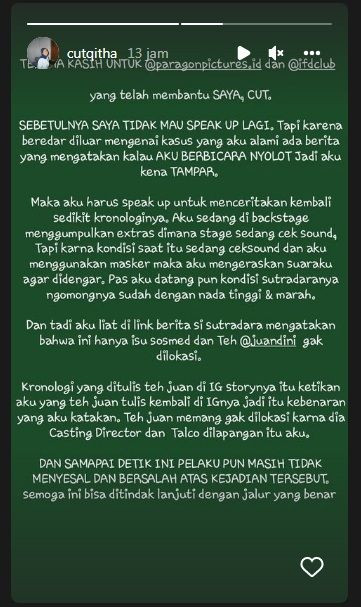 "Ada berita yang menyatakan, aku nyolot, makanya aku kena tampar," tulis Cut Qitha di Instagram Story, Kamis (1/9/2022).