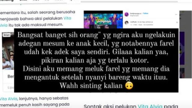 "Di sini aku memang meluk Farel yang memang dia mengantuk setelah nyanyi bareng waktu itu. Wih sinting kalian," jelas Vita Alvia.