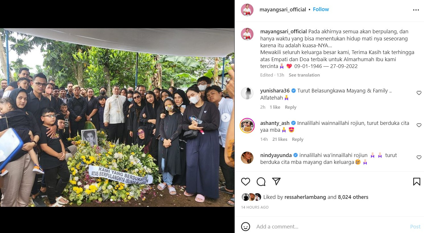 Tak pelak, dalam kalimat penutupnya, Mayangsari pun mengucapkan terima kasih atas doa yang diberikan publik atas berpulangnya sang ibunda.