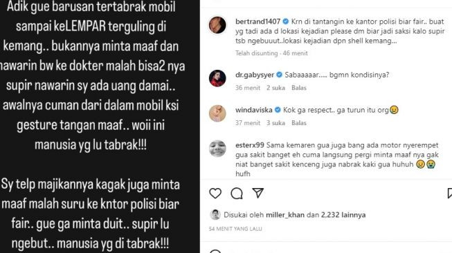 Melalui unggahan di Instagram miliknya, Betrand mengungkapkan jika sang adik sampai terhempas dan berguling-guling akibat ditabrak. Yang membuatnya makin kesal, sang pelaku yang merupakan supir pribadi justru tidak memiliki niat untuk meminta maaf dan justru menawarkan uang damai.