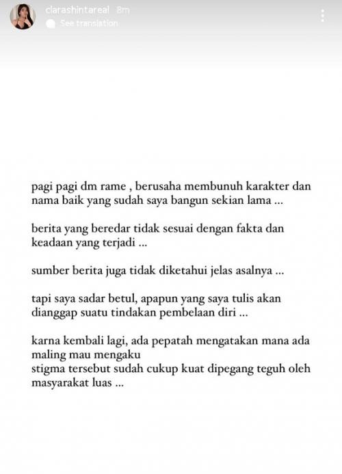 Melalui Instagram Story, Clara Shinta membantah isu miring yang tengah beredar. Tanpa menggunakan kata bernada emosi, wanita kelahiran tahun 1996 itu menyebut kemunculan kabar tersebut adalah cerita yang dibuat untuk membunuh karakternya.