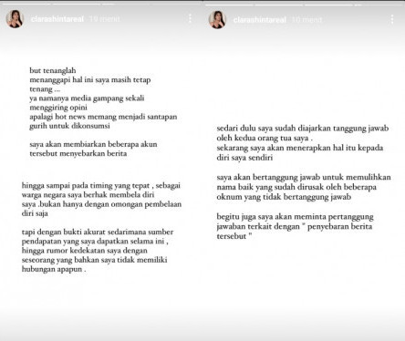Walau begitu, Clara Shinta menegaskan jika dirinya akan meminta pertanggung jawaban kepada pihak yang telah merusak nama baiknya. Pasalnya, informasi yang beredar di Twitter adalah hoaks lantaran tidak disertai bukti dan hanya tulisan dengan beberapa poin tuduhan.