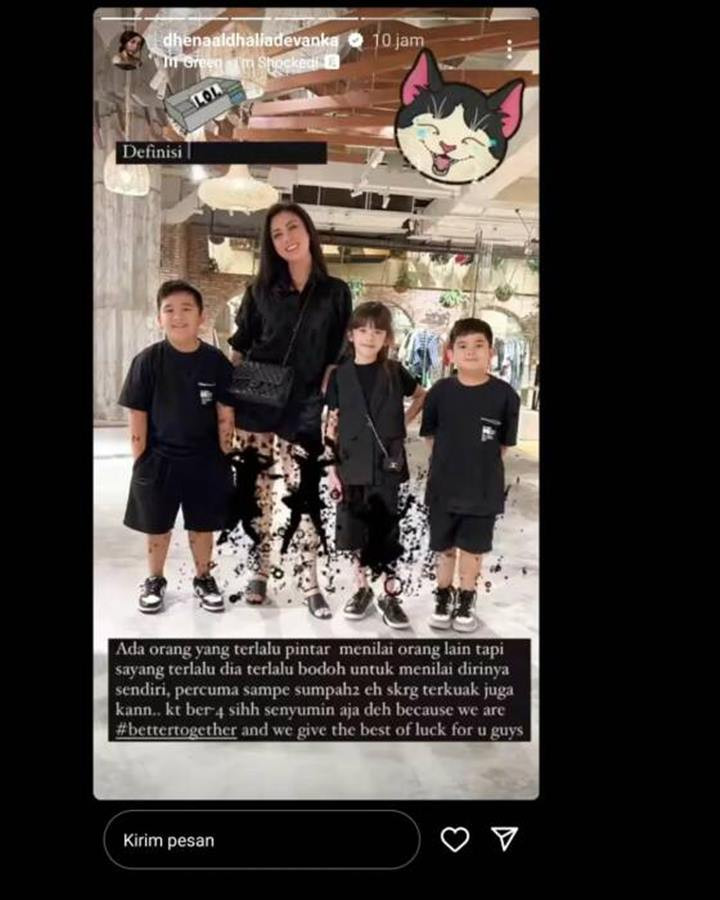 Menanggapi momen kebersamaan Ririn dengan keluarga Ijonk, mantan istri sang aktor, Dhena Devanka muncul dengan memberikan sindirian. Wanita berusia 37 tahun ini Dhena membagikan potret bersama anak-anaknya dan menulis perihal seseorang yang menjilat ludahnya sendiri.