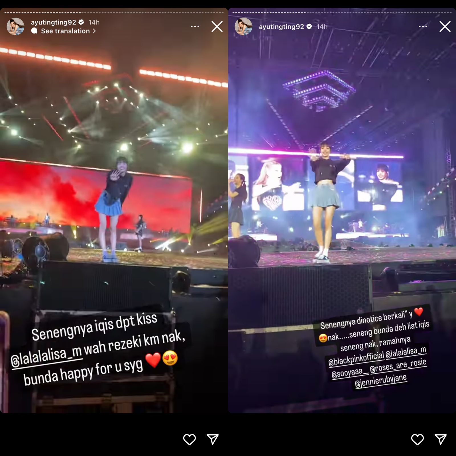 Penuh dengan gelora semangat, Ayu dan Bilqis pun nampak begitu senang dan tak berhenti berdendang sembari menari mengikuti alunan lagu yang dibawakan oleh Lisa, Jennie, Rose dan Ji soo. Tak sampai di situ, Lisa, member yang paling digemari 'Blink' Indonesia itupun, nampak menyadari kehadiran Bilqis.