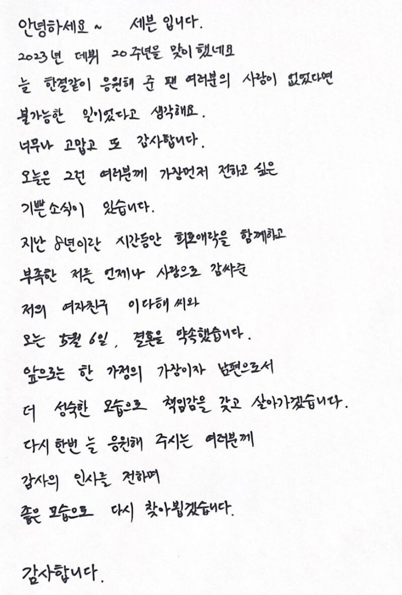 Pada 20 Maret, melalui unggahan di Instagram miliknya, SE7EN berterima kasih dengan dukungan para penggemarnya selama 20 tahun berkarir di industri hiburan. Selanjutnya dia juga mengumumkan rencana pernikahannya dengan Lee Dae Hae yang akan digelar pada 6 Mei 2023.