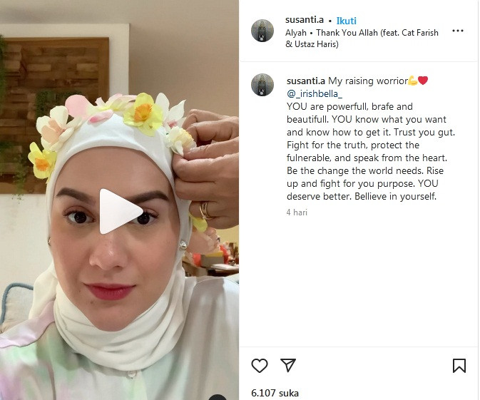 Melalui akun Instagram miliknya, Susanti Arifin baru-baru ini mengunggahan video singkat yang menampilkan wajah sang putri. Sebagai keterangan, dia menuliskan kata penyemangat bahkan menyebut jika Irish Bella layak mendapat yang lebih baik.