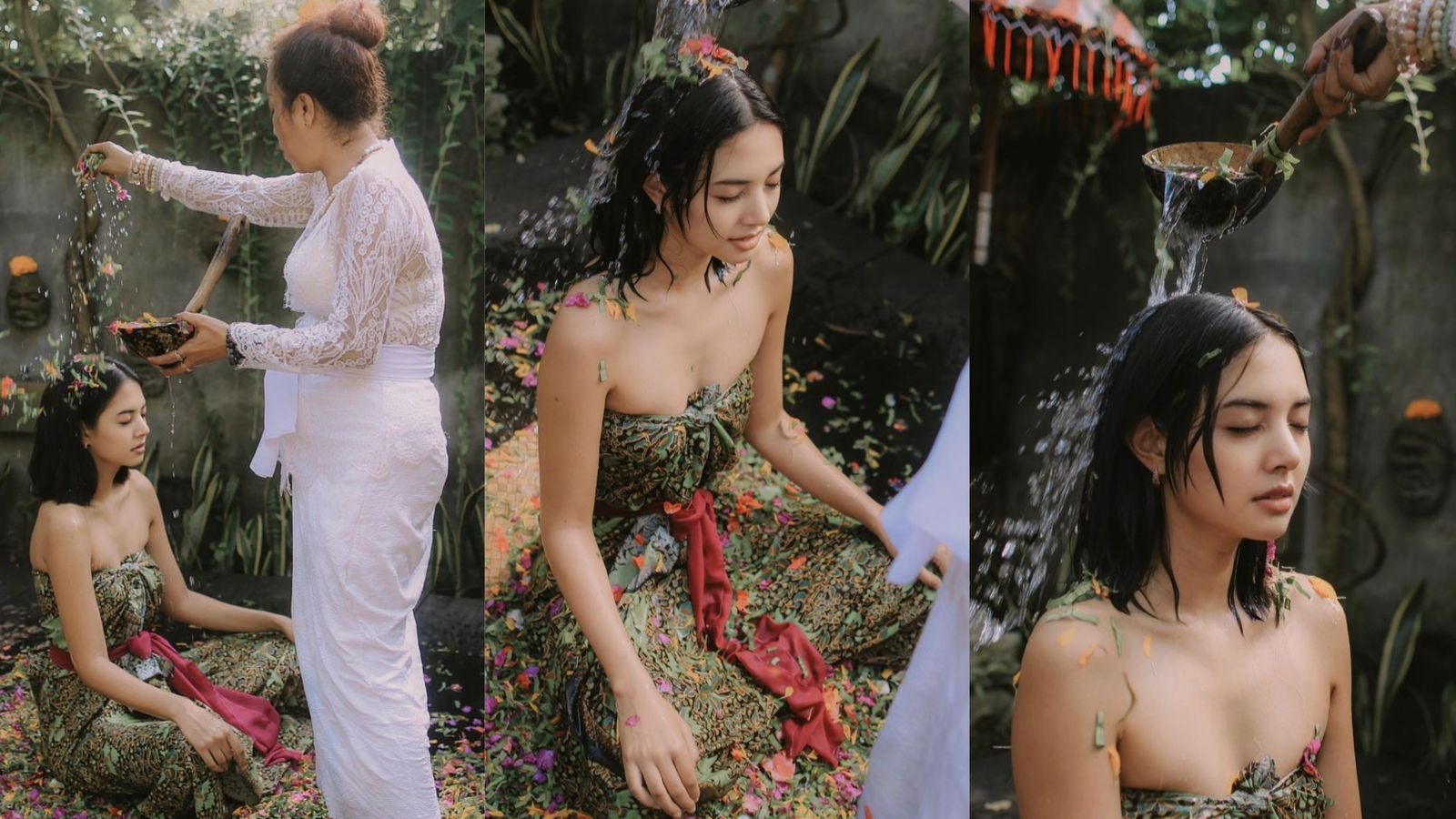 sedang duduk bersimpuh menggunakan kain khas Bali sembari disiram menggunakan