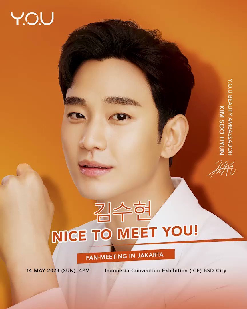Bersama brand kecantikan YOU Beauty, Kim Soo Hyun akan menggelar fan meeting perdananya bertajuk 'YOU x KIM SOO HYUN - NICE TO MEET YOU! FAN-MEETING IN JAKARTA' pada Minggu, 14 Mei 2023 pukul 4 sore WIB di ICE BSD City.