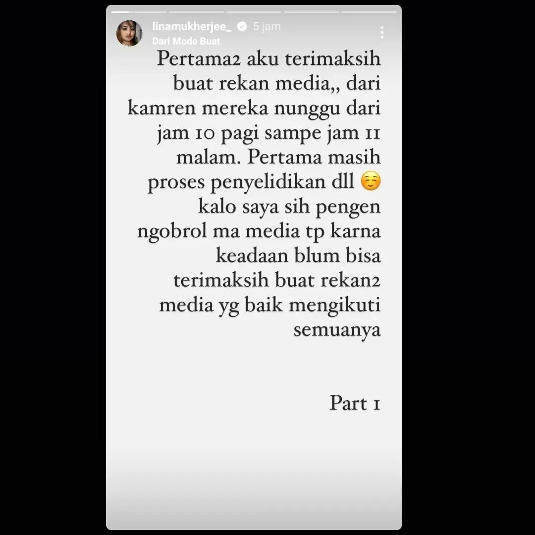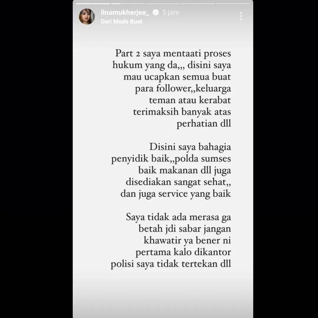 Meskipun status Lina Mukherjee telah menjadi tersangka, namun wanita berusia 30 tahun ini tidak jadi ditahan. Melalui unggahan di Instagram miliknya, Lina pun mengucapkan rasa syukurnya.