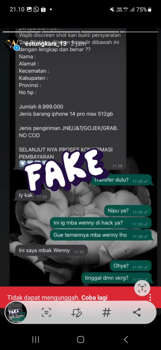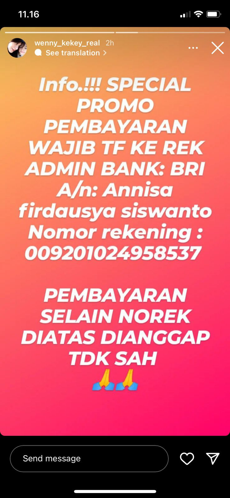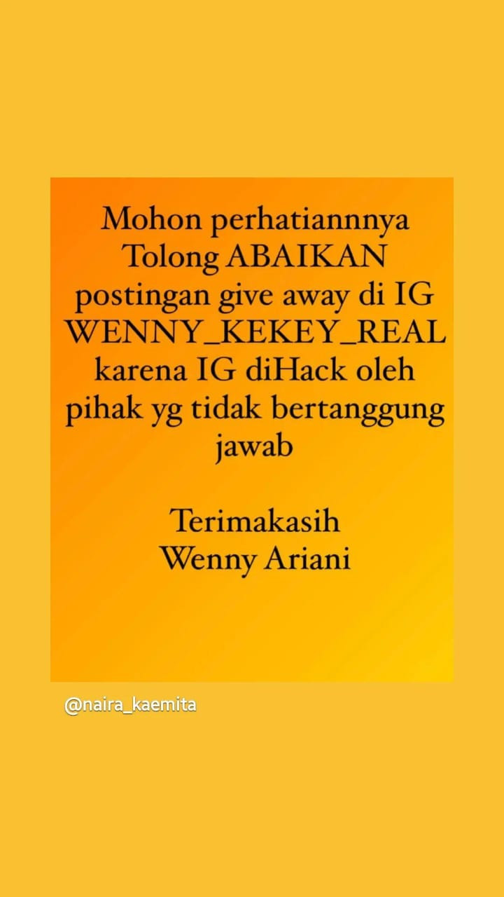 Namun, tak berapa lama, kerabat dari Wenny @estungkara mengunggah postingan yang menyatakan jika akun Instagram tersebut telah di-hack. Dia bahkan mengunggah bukti chat dengan oknum penipu tersebut.