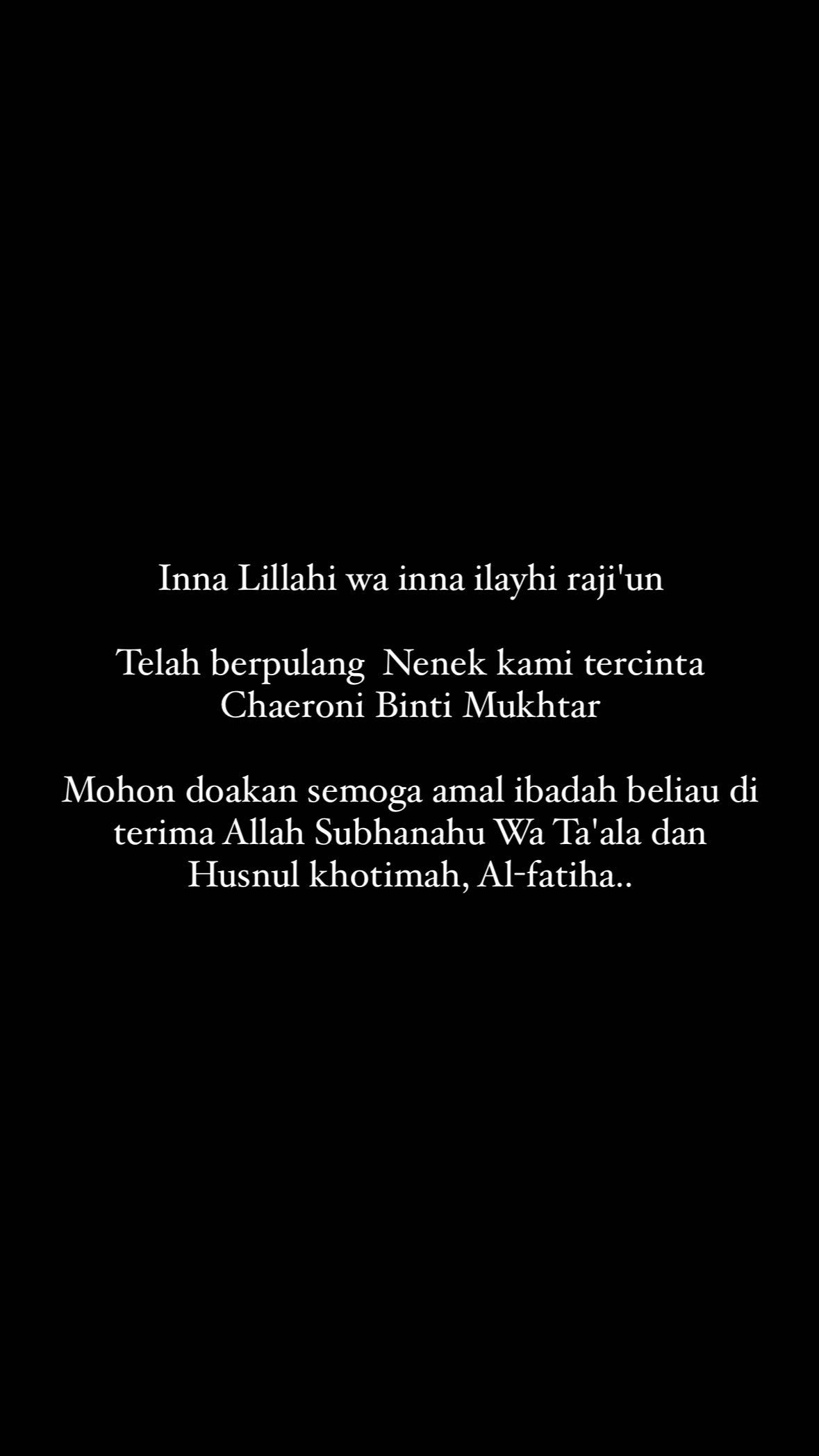 "Inna Lillahi wa inna ilayhi raji'un. Telah berpulang Nenek kami tercinta Chaeroni Binti Mukhtar" tulis Dara Arafah dalam unggahan Instagram Story-nya (16/9) tulisnya