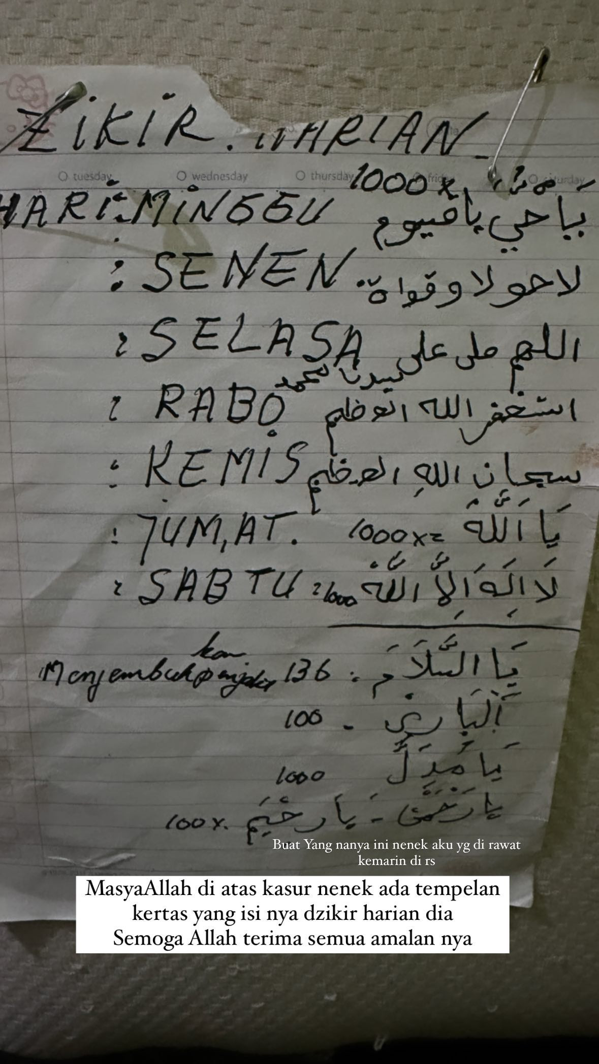 "MasyaAllah di atas kasur nenek ada tempelan kertas yang isi nya dzikir harian dia. Semoga Allah terima semua amalan nya" tambanya lagi