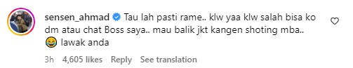 "Tau lah pasti rame.. klw yaa klw salah bisa ko dm atau chat Boss saya.. mau balik jkt kangen shoting mba.. lawak anda" tulis Sensen dalam kolom komentar (11/12)