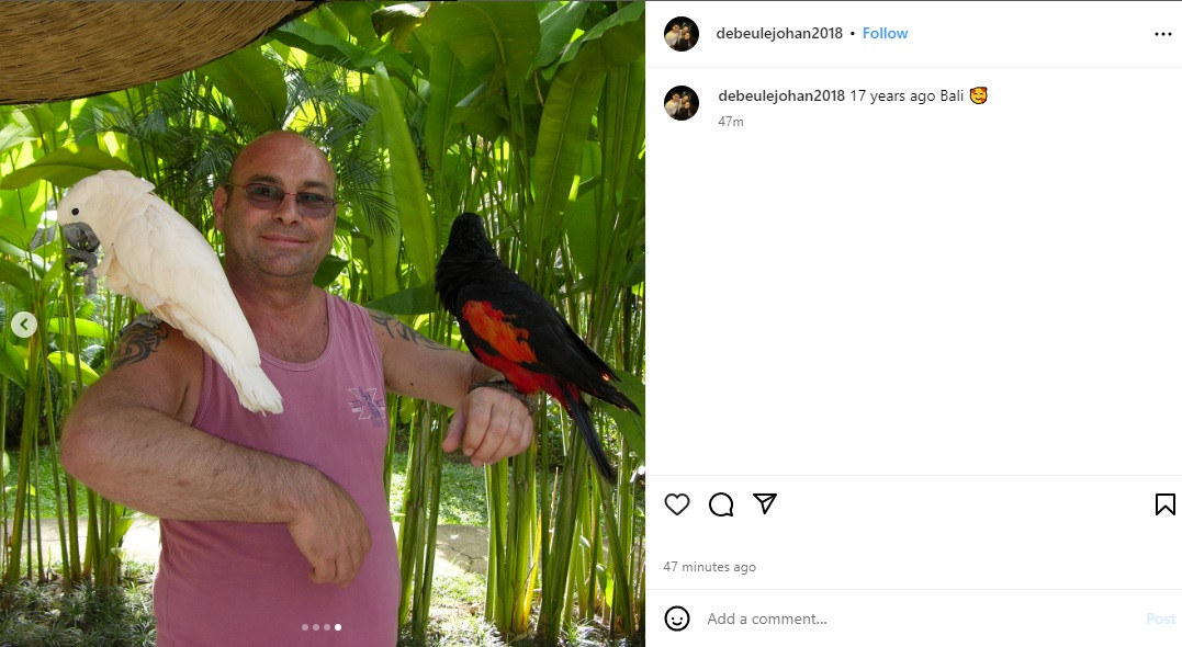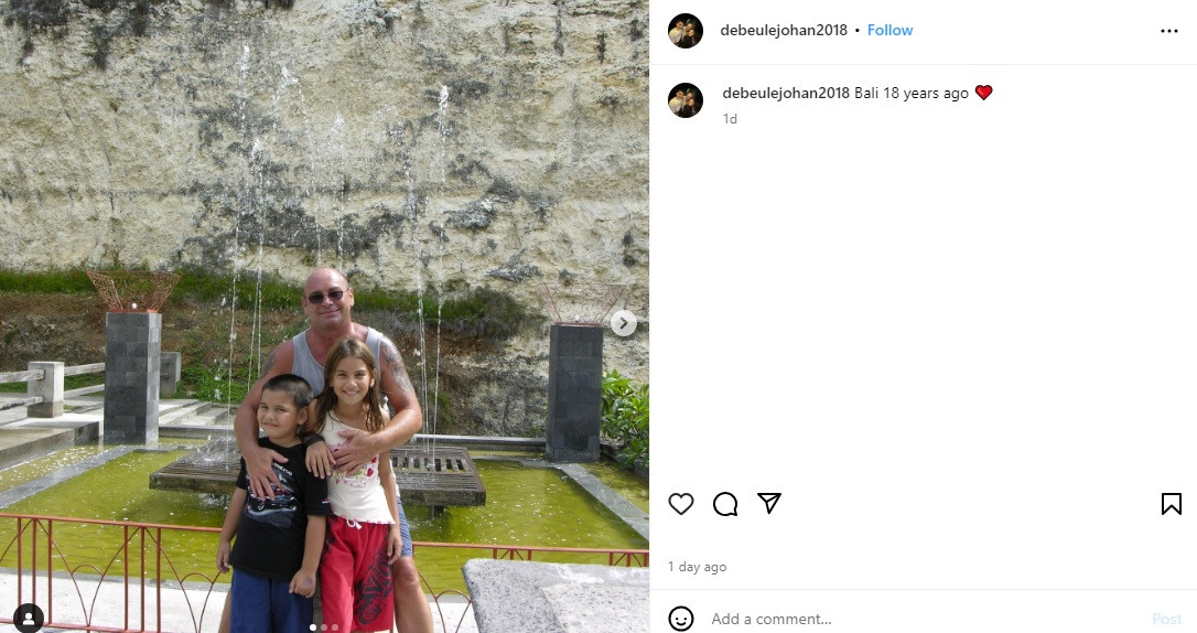 Dalam unggahan tersebut, Johan De Beule membagikan potret kenangannya bersama kedua anaknya di Bali, 17 tahun yang lalu. Mulai dari foto berisikan dirinya tengah memeluk Irish dan adiknya, hingga keseruan Irish berfoto bersama burung indah.