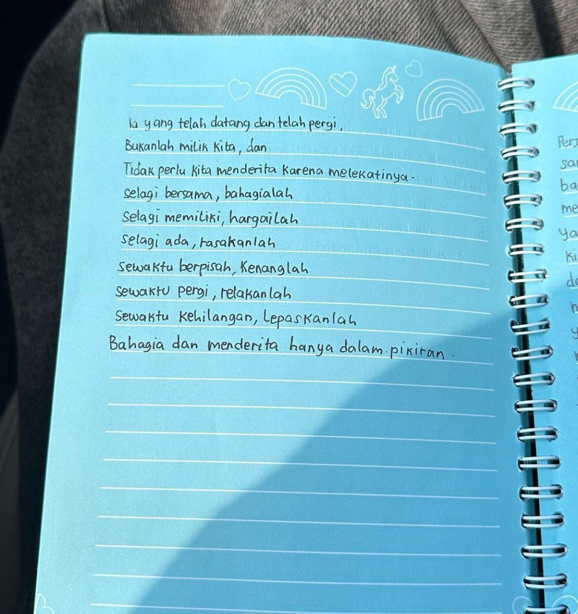 "Selagi bersama, bahagialah. Selagi memiliki, hargailah. Selagi ada, rasakanlah. Sewaktu berpisah, kenanglah. Sewaktu pergi, relakanlah, sewaktu kehilangan, lepaskanlah," sambungnya.