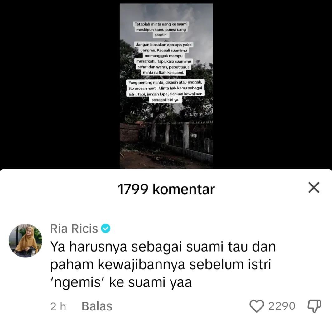 "Ya harusnya sebagai suami tau dan paham kewajibannya sebelum isti 'ngemis' ke suami yaa" tulis Ria Ricis