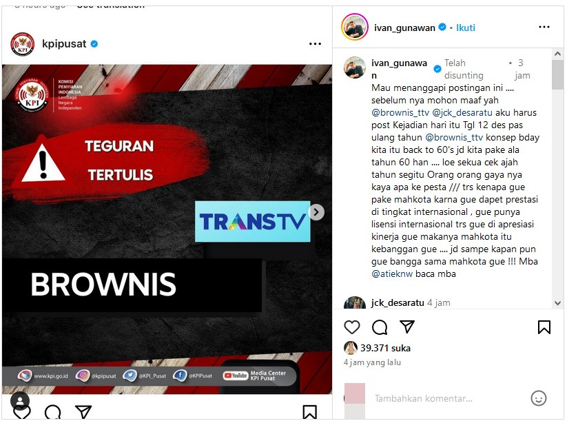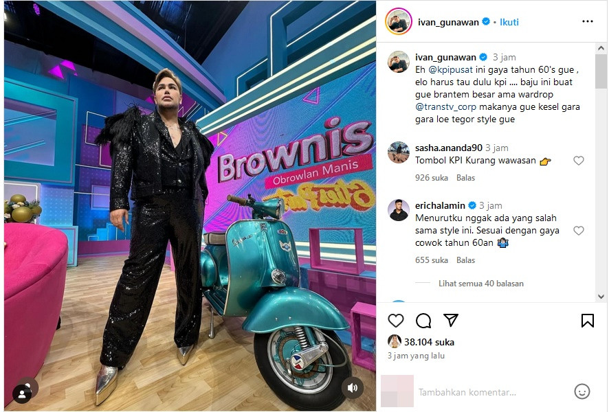 Dari unggahan tersebut, diketahui jika KPI menegur acara 'Brownis' lantaran dalam salah satu episodenya menampilkan host-nya yaitu Ivan Gunawan bergaya seperti perempuan. Igun pun memberi klarifikasi atas teguran tersebut dan menilai hal yang dilakukannya adalah fashion.
