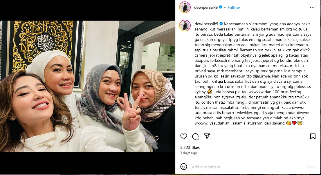 "Berteman sama mereka ini asik karena gak dikit-dikit camera jeprat jepret. Entah objeknya lagi jelek apalagi lagi kacau atau apapun, terkecuali memang harus jeprat jepret dengan kondisi oke dan ijin sama-sama. Itu yang buat aku nyaman sama mereka. Mereka tau privasi saya, mereka membantu saya, tapi mereka gak pernah ikut campur urusan saya kecuali seijin saya," tulis Dewi Perssik. (ND)