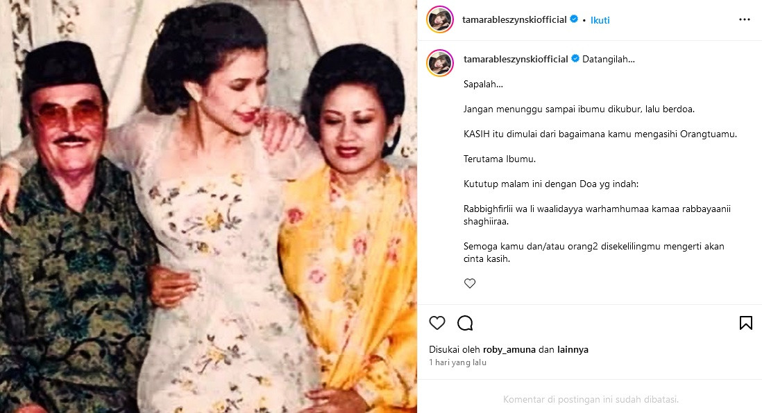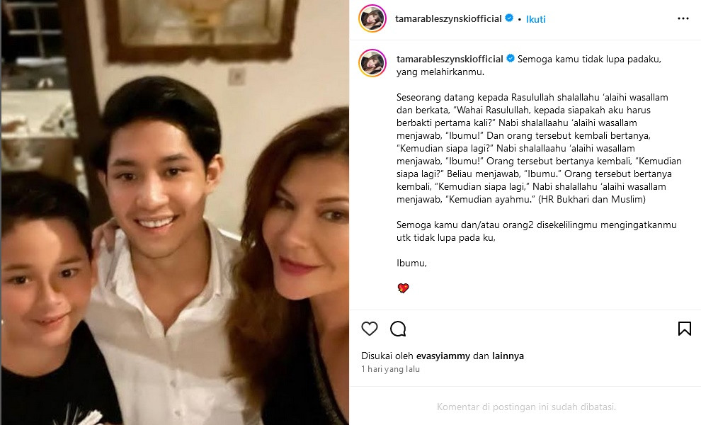 Dalam unggahan tersebut, terlihat Tamara Bleszynskimenyampaikan harapan agar putranya tidak melupakannya. Bahkan dia sampai menyisipkan sebuah hadist yang menyinggung bahwa derajat seorang ibu yang paling harus dihormati sebelum ayah.