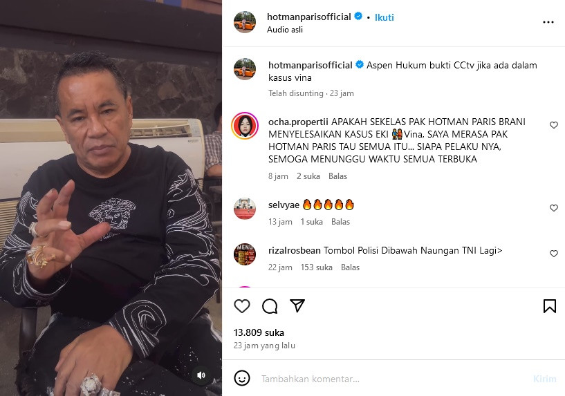 Para pria yang terlihat dalam rekaman CCTV juga terlihat membawa benda tumpul seperti kayu dan balok. Meski begitu rekaman CCTV yang diduga memperlihatkan pembunuhan Vina Cirebon belum dapat dipastikan kebenarannya atau tidak. Terkait hal ini, Hotman Paris selaku kuasa hukum keluarga Vina pun buka suara.