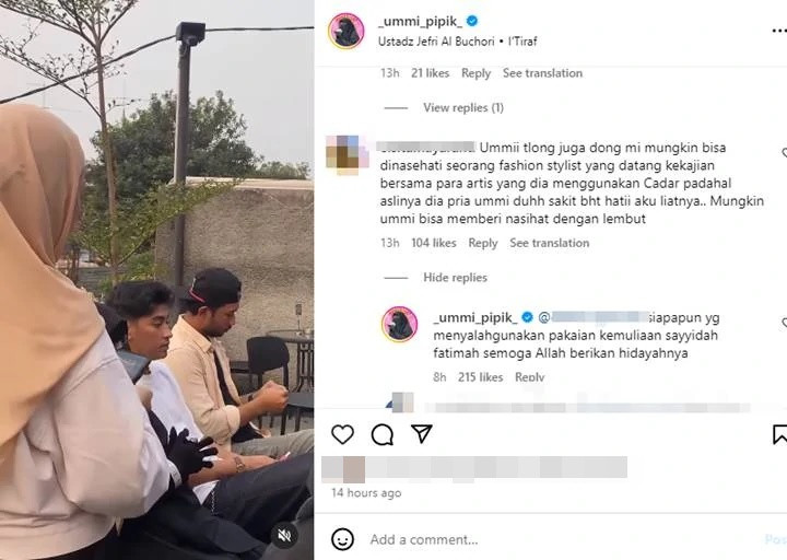 "Umi gimana tanggapannya tentang seorang fashion stylist terkenal yang dating ke kajian duduk di tempat akhwat (Wanita) memakai cadar padahal dia Ikhwan (laki-laki) dan teman-teman tidak menegurnya," tulis @fnn*** dikutip dari kolom komentar unggahan @_Umi_pipik_, Senin (22/7/2024).