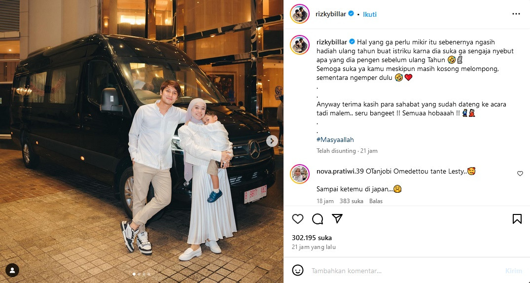 Mengakhiri keterangan foto tersebut, aktor bernama asli Muhammad Rizky itu juga mengucapkan terima kasih kepada keluarga dan sahabat-sahabat yang sudah hadir di acara kejutan ulang tahun Lesti Kejora.