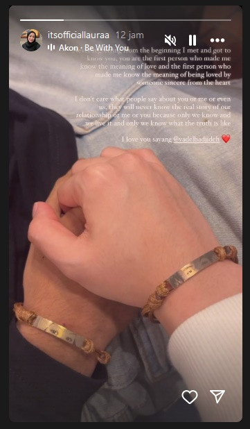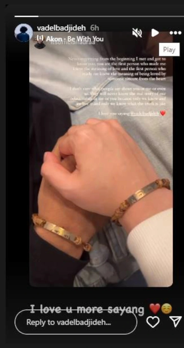 "Aku tak peduli apa kata orang tentang kamu atau aku atau bahkan tidak akan pernah tahu kisah sebenarnya dari hubungan kita atau aku atau kamu karena hanya kita yang tahu dan hanya kita yang menjalaninya dan hanya kita yang tahu seperti apa kebenarannya. Aku cinta kamu sayang @vadelbadjideh," sambungnya.