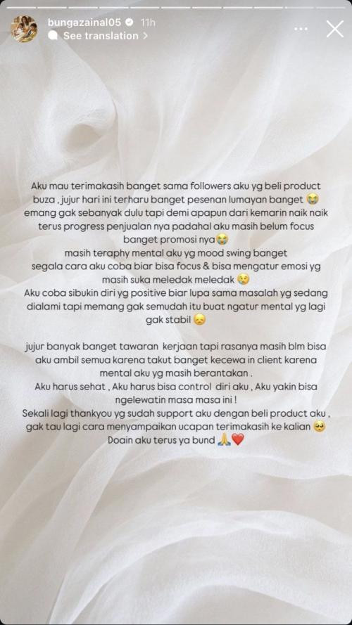 "Masih terapi mental aku yang mood swing banget segala cara aku coba biar bisa fokus dan bisa mengatur emosi yang masih suka meledak-ledak," ujar Bunga Zainal dikutip dari unggahan Instagram miliknya.