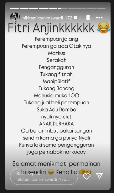 "Fitri A**inkkkkkkk, perempuan jalang, Perempuan ga ada Otak nya, Markus, Serakah, Pengangguran, Tukang fitnah, Manipülatif, Tukang Bohong, Manusia muka 100, Tukang jual beli perempuan, Suka Adu Domba nyali nya ciut, ANAK DURHAKA," postingan Nikita Mirzani yang diduga sindir Fitri Salhuteru.