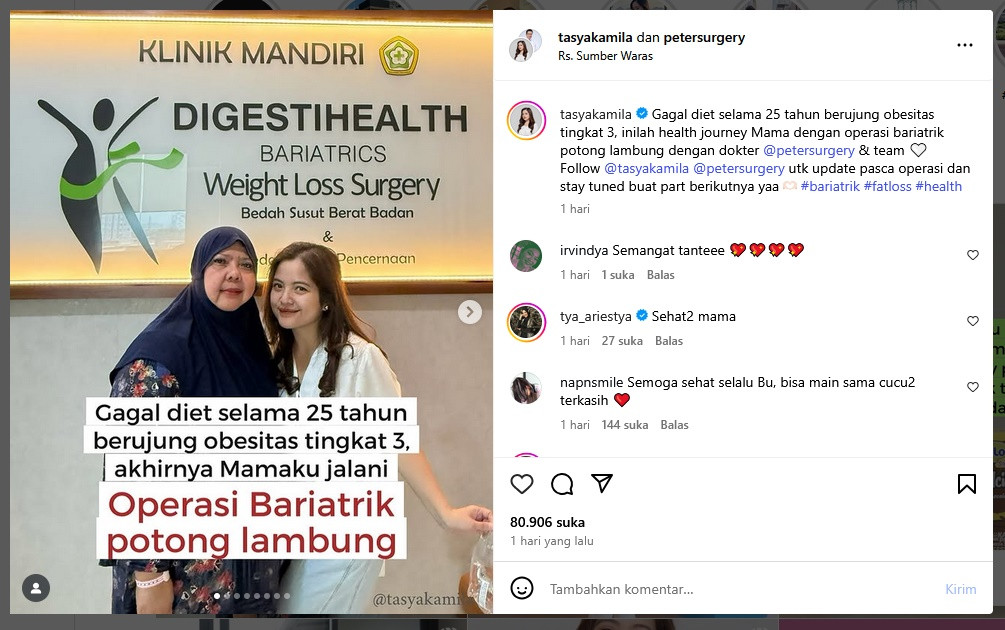 "Gagal diet selama 25 tahun berujung obesitas tingkat 3, inilah health journey Mama dengan operasi bariatrik potong lambung," tulis Tasya Kamila.