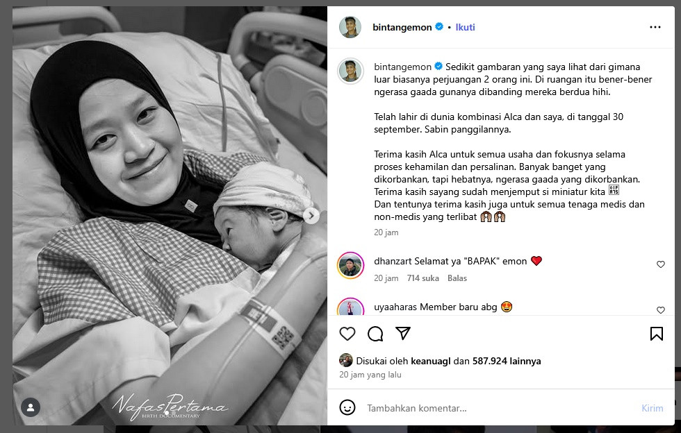 "Telah lahir di dunia kombinasi Alca dan saya, di tanggal 30 September. Sabin panggilannya," tulis Bintang Emon.