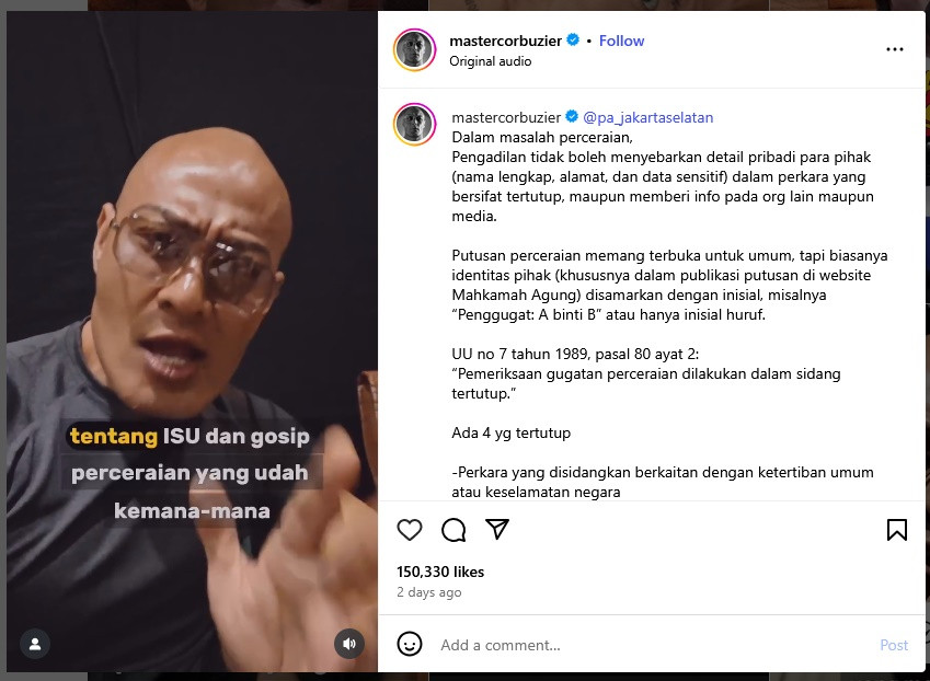 Bukan hanya itu, Deddy Corbuzier juga menyinggung ucapan humas Pengadilan Agama Jakarta Selatan terkait berkas gugatan atau permohona cerai antara dirinya dan Sabrina. Artis berusia 48 tahun itu tak habis pikir bagaimana petugas pengadilan agama justru menjadi 'corong' kabar perceraian para artis.