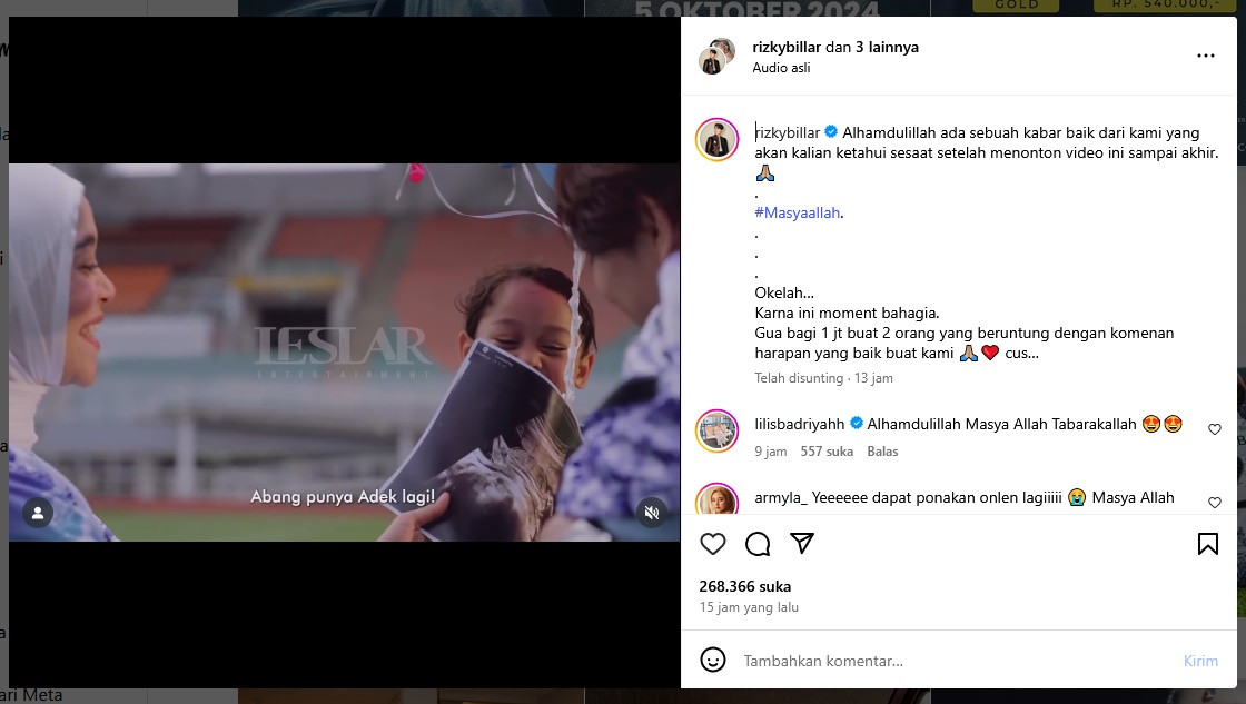 "Alhamdulillah ada sebuah kabar baik dari kami yang akan kalian ketahui sesaat setelah menonton video ini sampai akhir," tulis Rizky Billar.