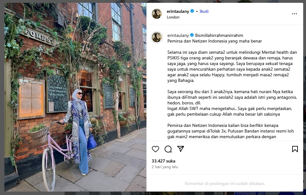 "Selama ini saya diam semata2 untuk melindungi Mental health dan PSIKIS tiga orang anak2 yang beranjak dewasa dan remaja, harus saya jaga, yang harus saya sayangi. Saya berupaya sekuat tenaga saya untuk mencurahkan perhatian saya kepada anak2 semata2 agar anak2 saya selalu Happy, tumbuh menjadi masa2 remaja2 yang Bahagia," tulis Erin di Instagram miliknya.